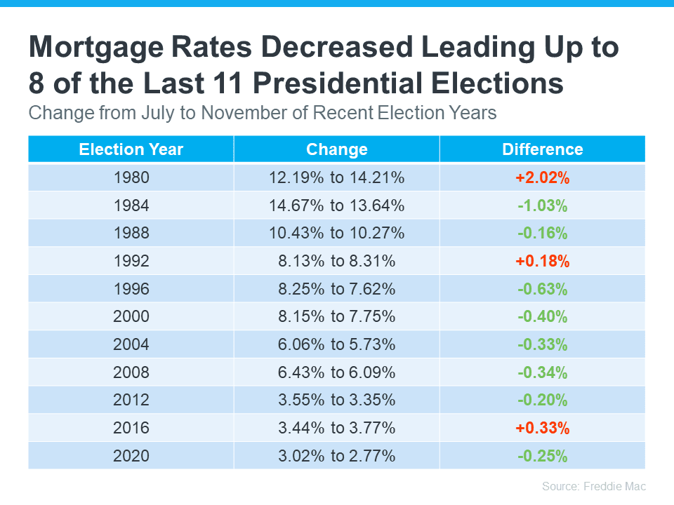 Mortgage rates are important because they affect how much your monthly payment will be when you buy a home. Looking at the last 11 Presidential election years, data from Freddie Mac shows mortgage rates decreased from July to November in eight of them (see chart below):